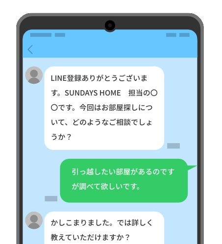 LINEで手軽にできたのがよかった。返事も早くて助かった。なるべく早く引っ越ししたかったので、ネットで見つけた物件を転送したらすぐに調べてくれた。